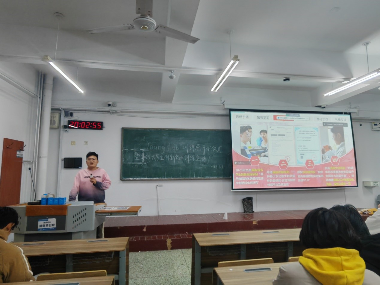 最后,2024年度国家奖学金获得者、2024年第十四届“挑战杯”山东省大学生创业计划竞赛金奖项目主创应化2203郑稳超结合自己参与大创项目和学科竞赛的过程分享参赛心路历程,传授创新经验,以及获得国家奖学金的心得体会;2024年国创立项目负责人张浩雨,围绕大创项目书的填报要求、标准和细节进行分享。通过两位同学“现身说法”,发挥朋辈引导,榜样领航作用,帮助低年级学生点亮理想信念之光,引导他们积极投身科创实践。