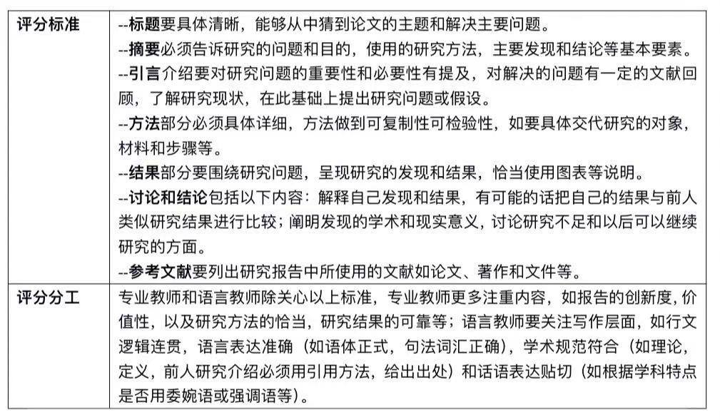 1.研究报告或研究计划(附件1)。演讲作品是基于一篇用英语撰写的研究报告或研究计划。研究报告包括标题、摘要、引言、方法、结果、讨论和结论、致谢和参考文献等基本部分。长度不少于 2000 英语单词。研究计划包括标题,摘要,研究目的,研究意义,文献回顾,研究问题,拟采用方法,预期结果,参考文献。长度在 1500 词左右,评分标准见表2。